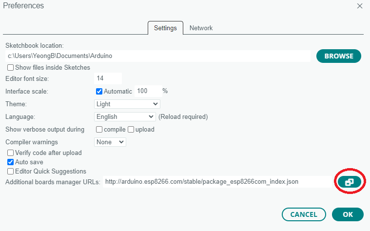 2. Additional board manager URLs 오른쪽에 버튼 클릭 후 http://arduino.esp8266.com/stable/package_esp8266com_index.json 붙여 넣기