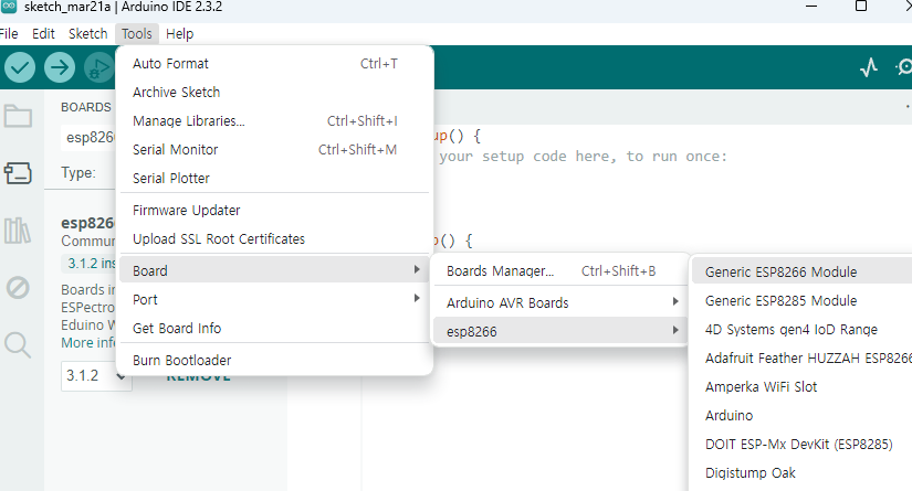 2. Tools - Board - esp8266 Generic ESP9266 Module 선택
