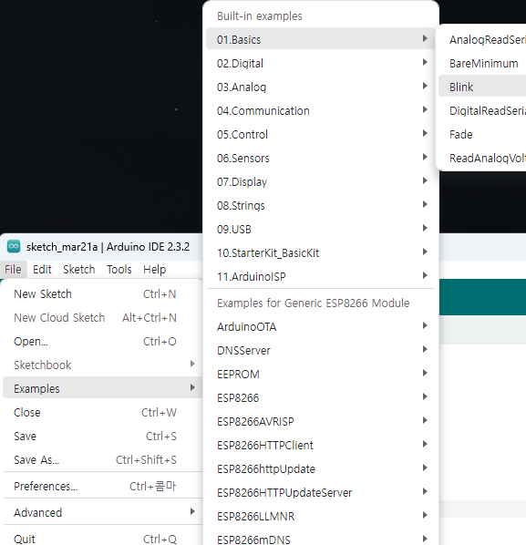 4. File - Examples - 01 Basics - Blink 선택