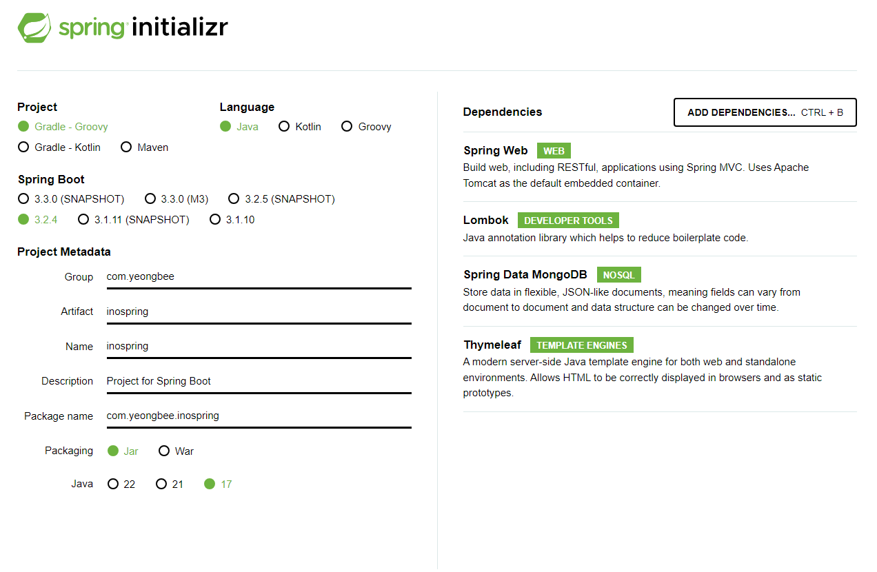 자바는 17, SpringBoot 버전은 3.2.4를 사용한다.