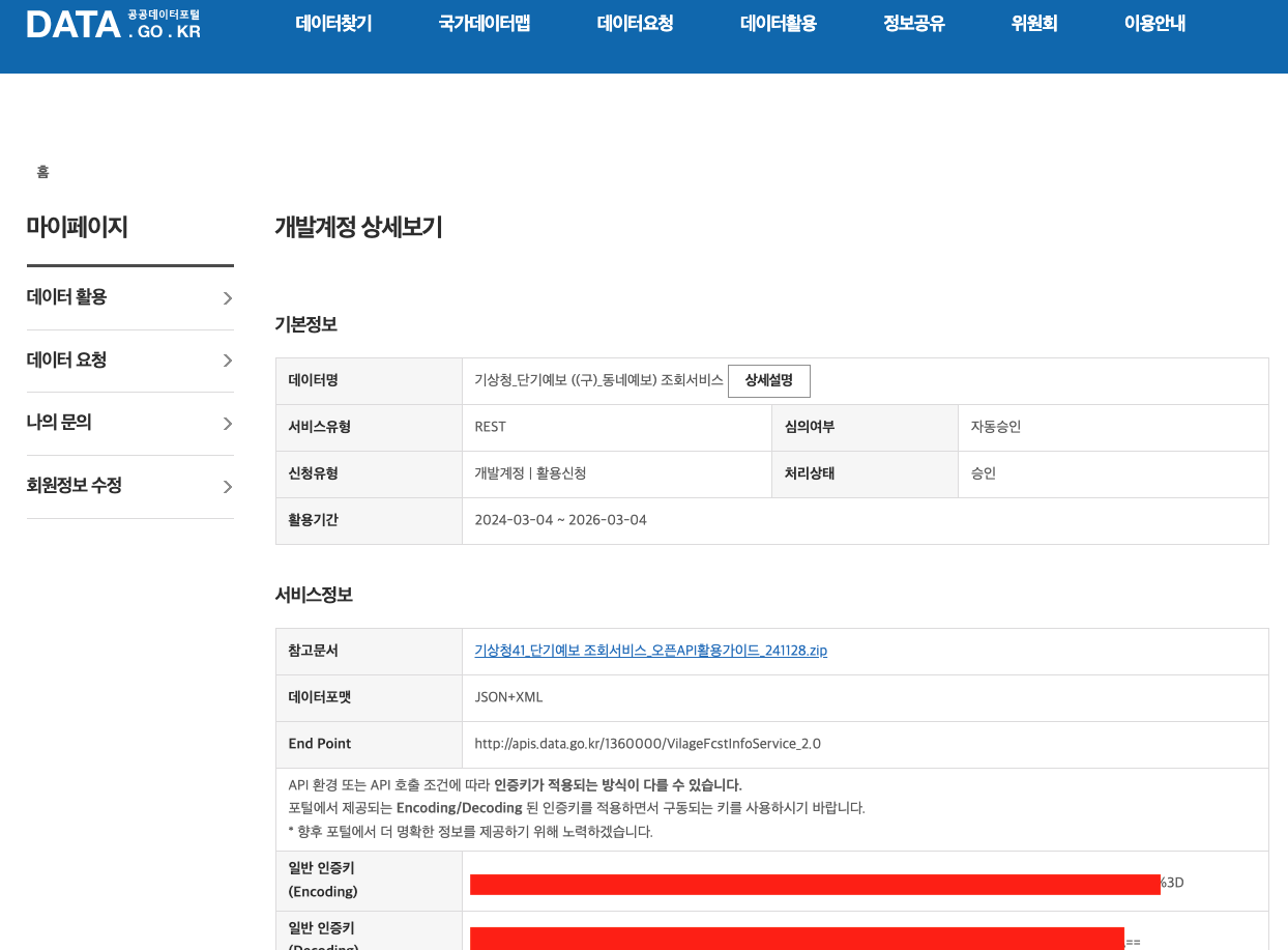 활용 신청을 클릭하면 잠시 후 승인이 나고 신청한 인증키를 받을 수 있다.